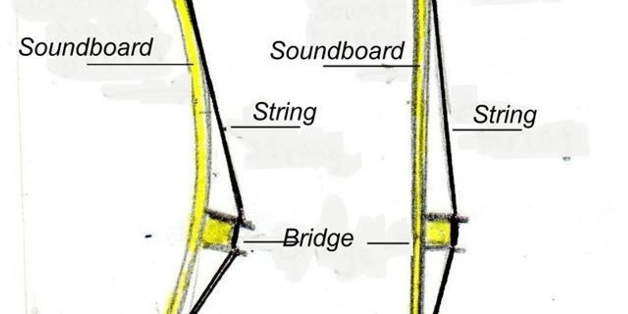 The sample on the left illustrates the the bow or "crown" in a soundboard during a time of high humidity (greatly exaggerated). There is more tension on the string so the pitch sounds higher.