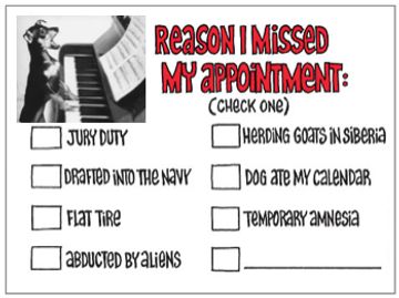 You will be charged half of my tuning fee ($83). I will wait for up to 15 minutes for you to arrive. If you are running late, please call me to let me know. I'm very understanding! I'll try to reach you at the phone number that you gave to me when we scheduled. If we can't get in touch I'll leave my bill at your door.